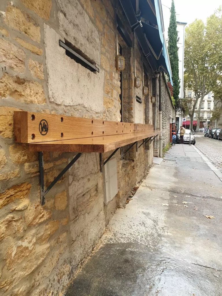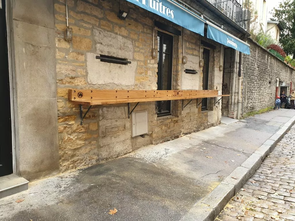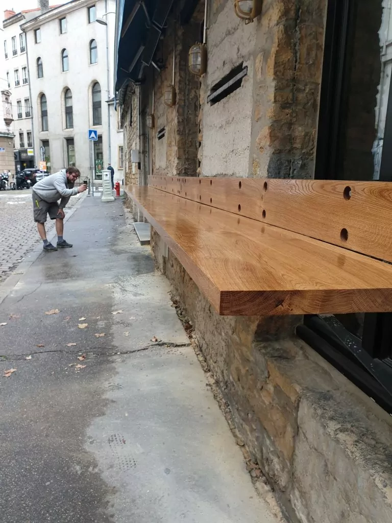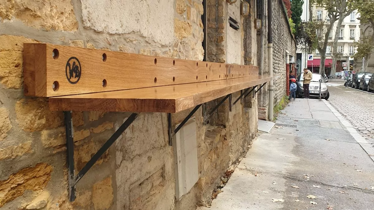 Des plateaux en chêne massif vernis posé sur charnières invisibles soutenus par des équerres en acier, le tout se devait d’être repliable.